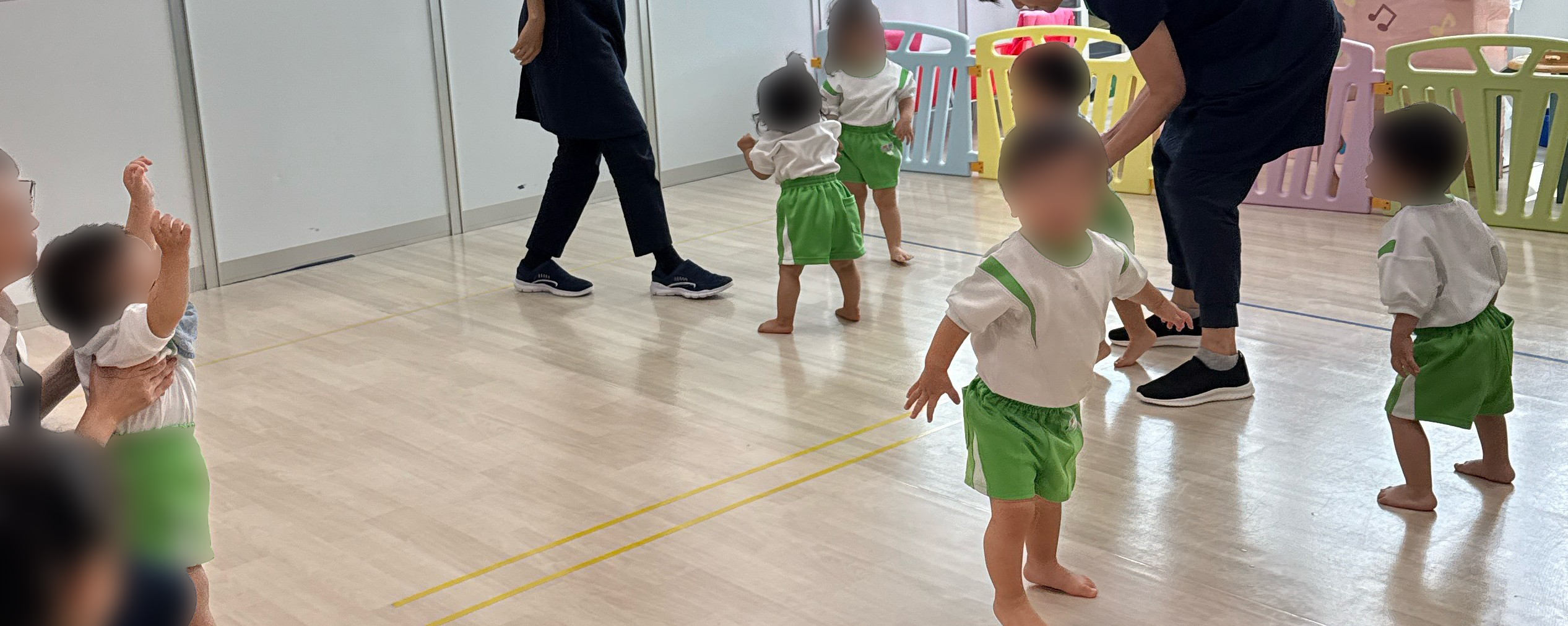うめ組(満1歳児クラス)では、夏前はお母様と離れる際に涙が見られることもありましたが、今ではすっかり慣れて先生やお友だちと一緒に安心感をもって活動に参加するようすが見られています。