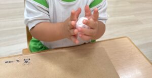 粘土が大好きなもも組さん。ちぎったり伸ばしたりだけでなく、今回は『丸める』ことにも挑戦しています。