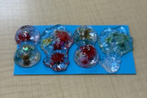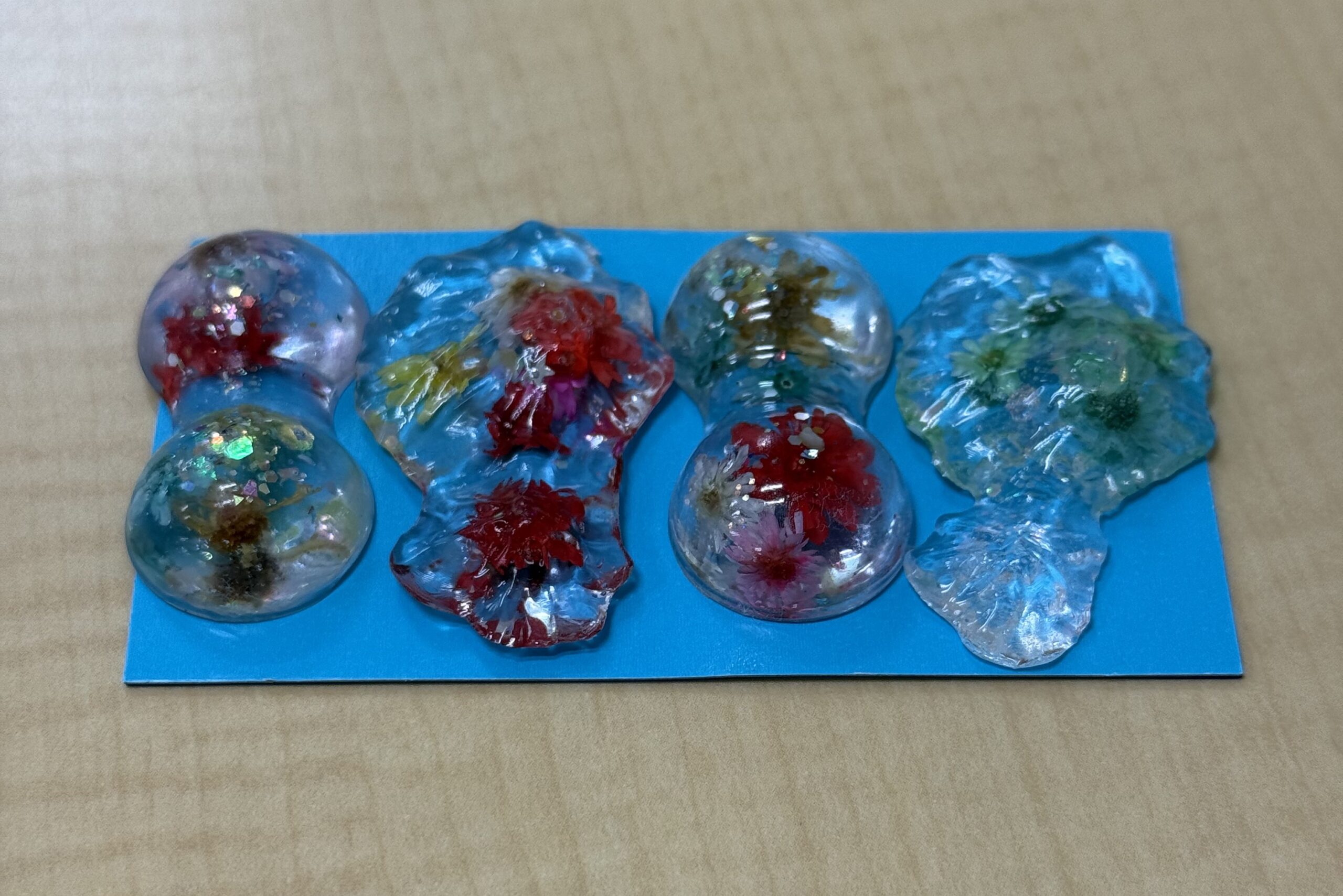 ドライフラワーやラメパウダーを自分で選び配置し、紙コップにいれたレジンを型に流しこみ、『箸置き』の完成です。