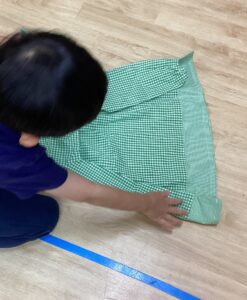 例えば①普段身につけているもの(体操服、スモック、ハンカチ)を畳む、②風呂敷で包む、③ぞうきんを絞るなどです。どのように扱うのか自分で考え、スピードだけではなく細部まで意識して丁寧に行えているか、グループにわかれてお互いにチェックを行いました。どのように畳むとシワも伸びて綺麗に畳めるのかな?お友だちが畳んだ物と比べてどこが違うのかな?など、よく見て比べて違いを考えます。はっと気づいてやり直し、ステキな笑顔になったのを見逃さず、声かけし自信に繋げています。今月は基本的な生活習慣の定着の再確認です。