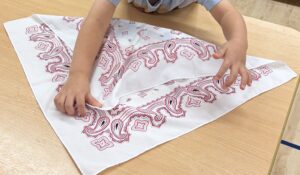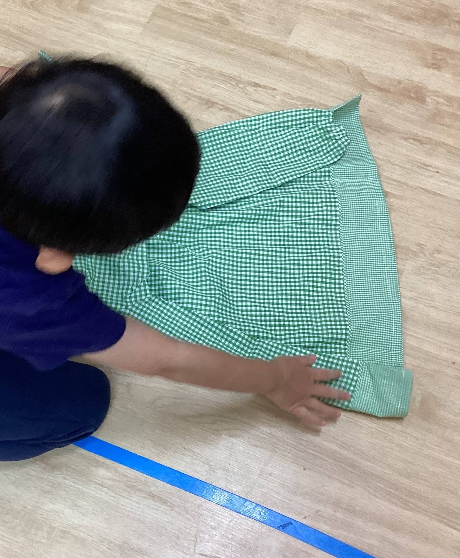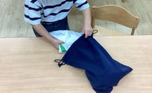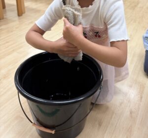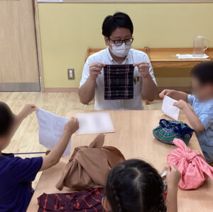 伸芽’Sクラブ目黒校、年少~年長クラスでは、基本的生活習慣の定着に向けて日々いろいろなことに取り組んでいます。今日の課題は、「たたむ、つつむ、しぼる」です。