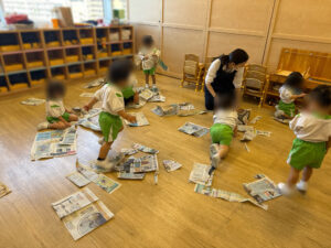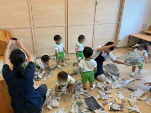 初めは、新聞紙の大きさや質感におそるおそる触れていたお子さまたちも、慣れてくると大胆にちぎったり、ぎゅっと丸めてみたり、自分の手の動きや音を楽しむ姿が見られました。