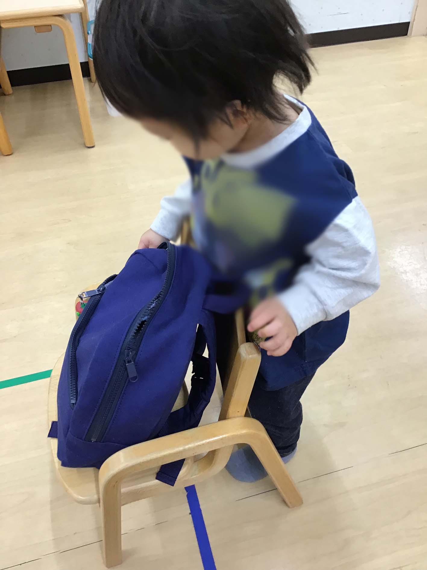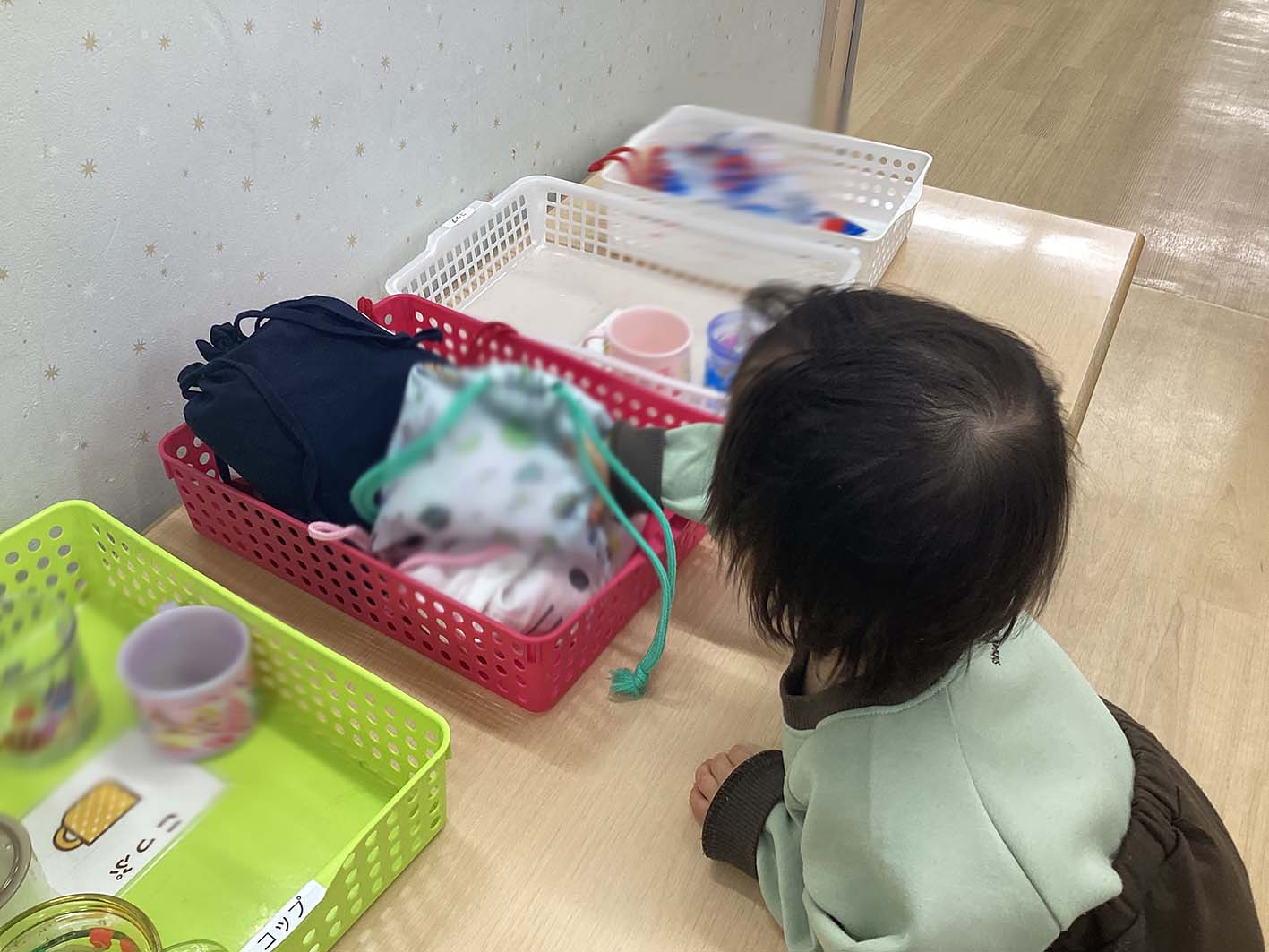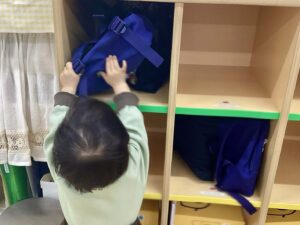 大崎校のうめ組(満1歳児クラス)、もも組(1歳児クラス)の朝のお支度のようすについてご紹介いたします。