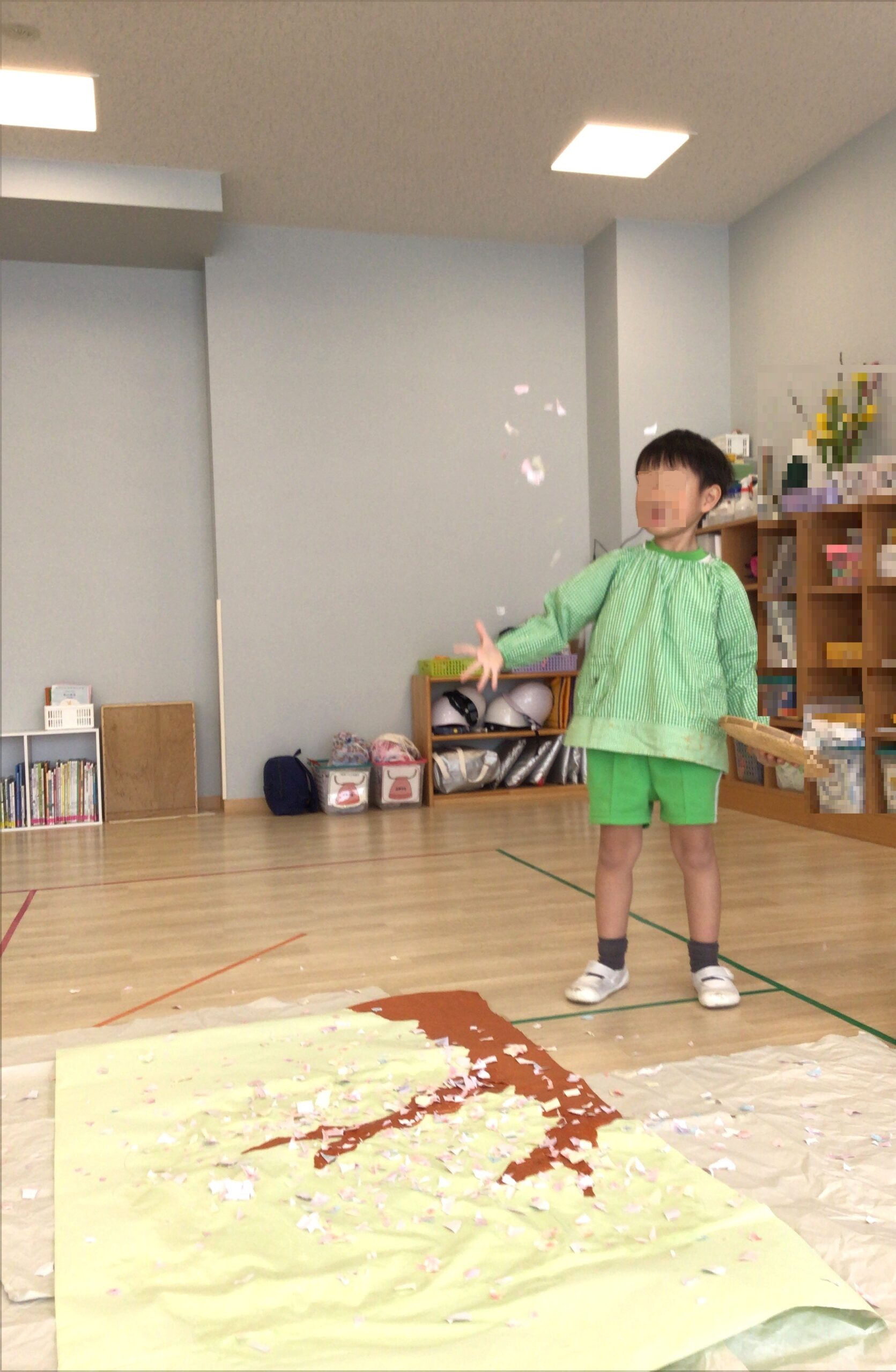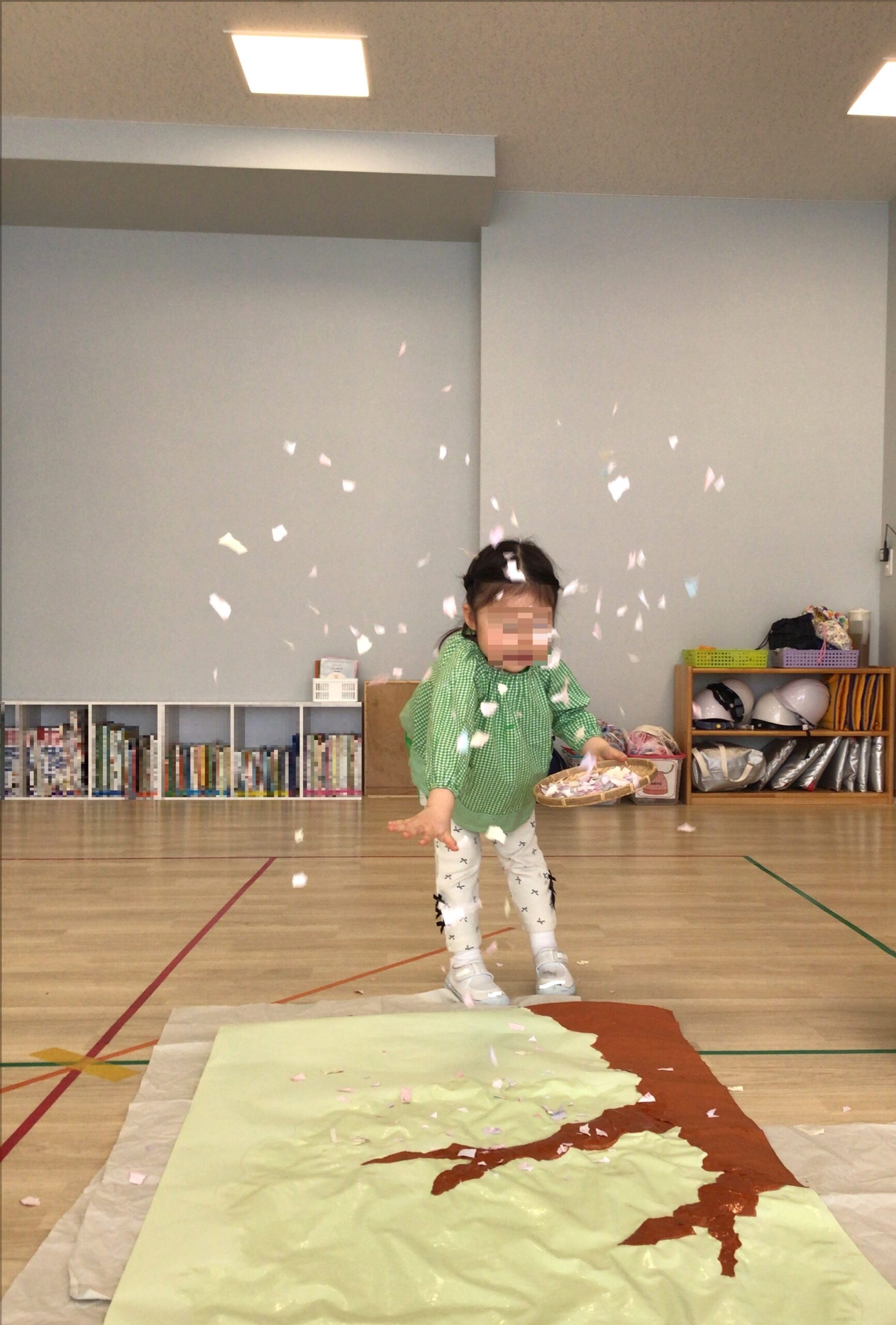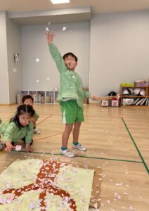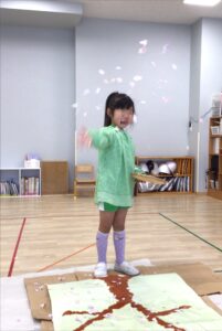 いよいよ一番盛り上がる時間です。印象深いおじいさんのセリフ「枯れ木に花を咲かせましょう!」を元気よく声に出しながら、花びらをまきます。最初は少し照れながらも、紙が舞うようすに気持ちが高まり、次第に笑顔いっぱいに。