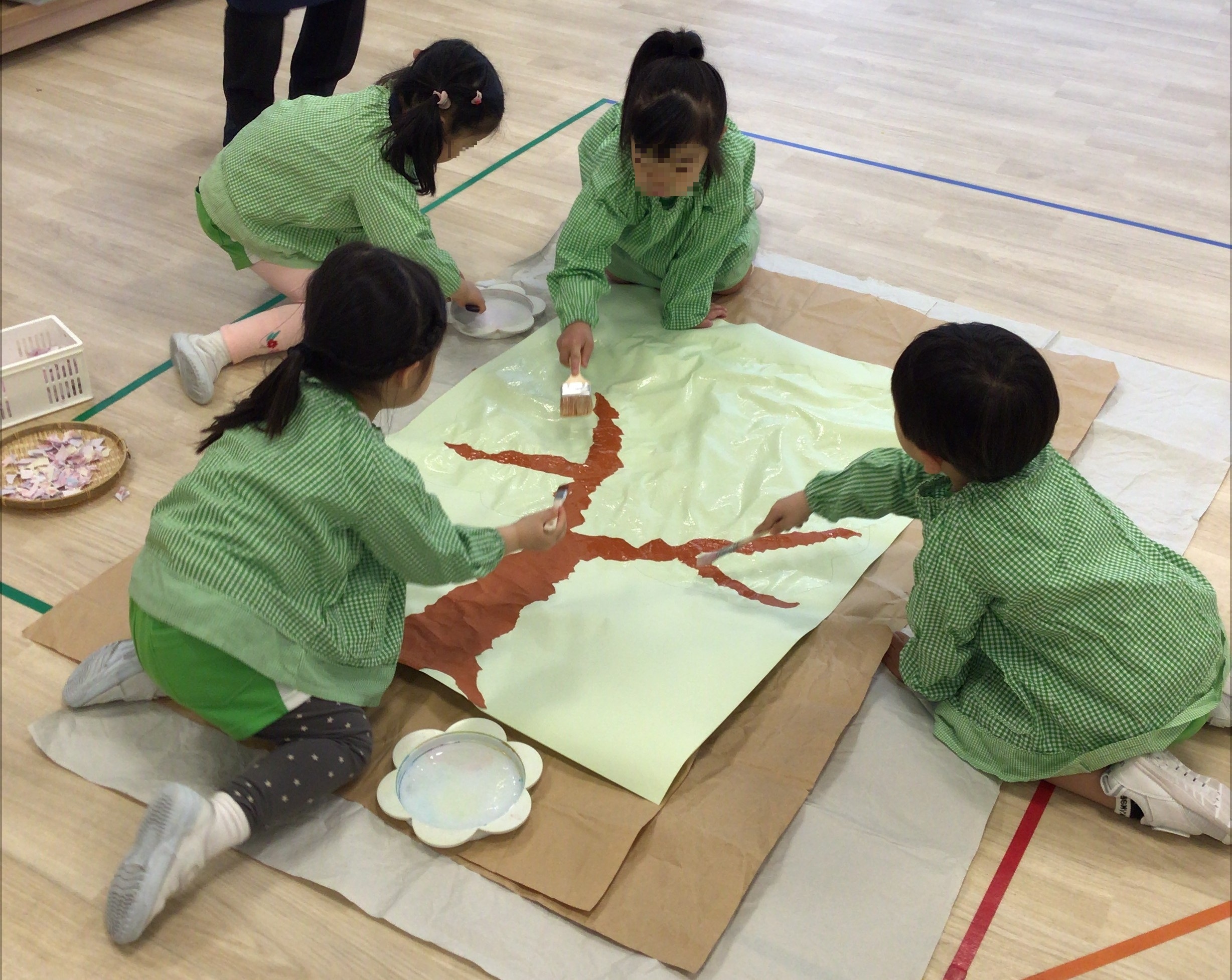 枯れ木にまくのは、桜柄のペーパーをちぎって細かくしたものと切り紙で作った桜の花。何週間もかけて、皆さんと少しずつ準備を進めてきました。